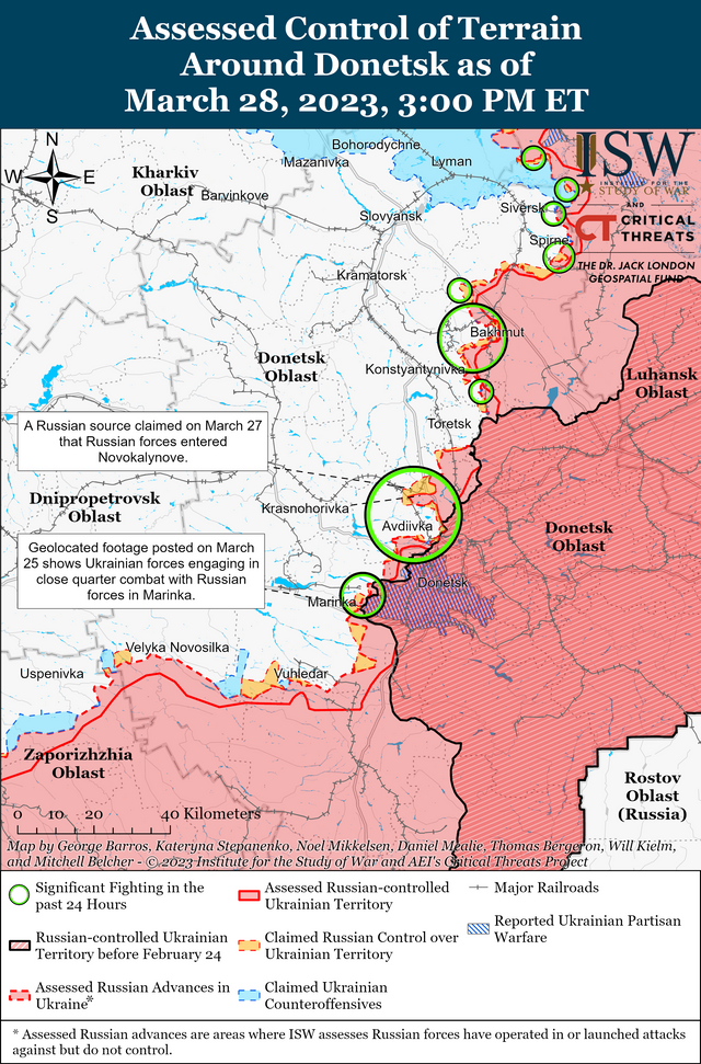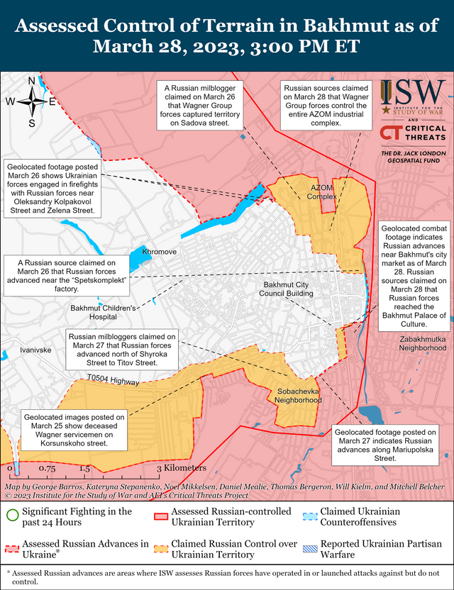 28 березня окупаційні війська продовжили наступальні дії в районі Бахмуту та просунулися в межах міста. Геолокаційні кадри, опубліковані 28 березня, свідчать про те, що російські війська, ймовірно, просунулися в південному Бахмуті та до Бахмутського міського ринку в центрі міста.