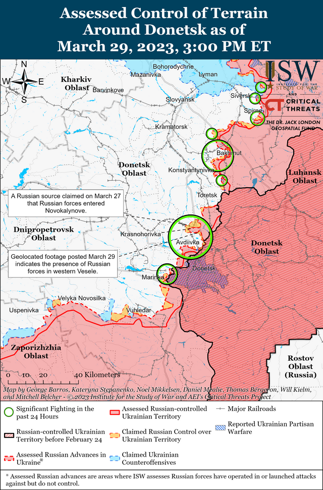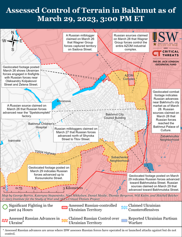Геолокаційні кадри, опубліковані 28 та 29 березня, свідчать про просування російських військ у південній та південно-західній частинах Бахмута.