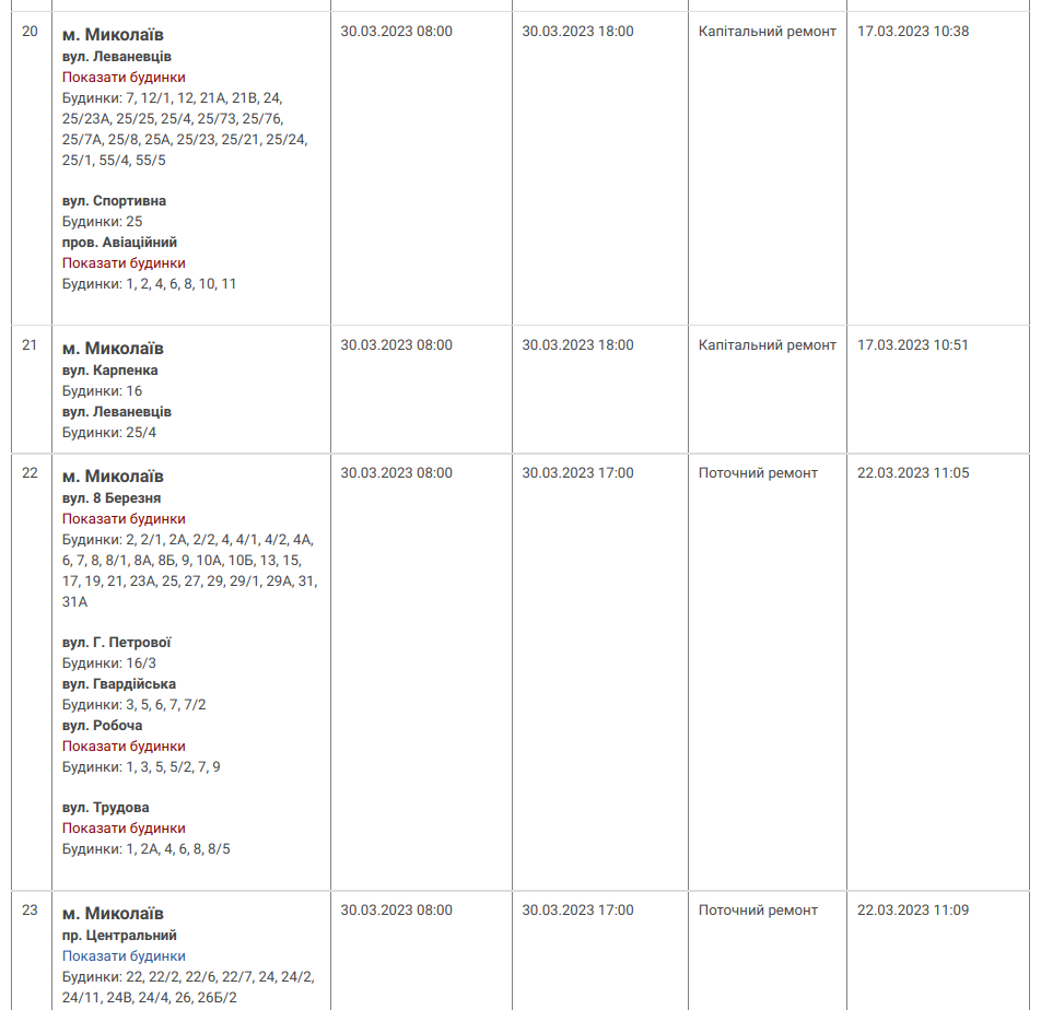30 березня, у Миколаєві буде проходити планове відключення електроенергії. Згідно з інформацією обленерго, відсутність електроенергії пов'язана з проведення ремонтних робіт. З 8:00 до 17:00 світла не буде за адресами: Джерело: 0512.com.ua