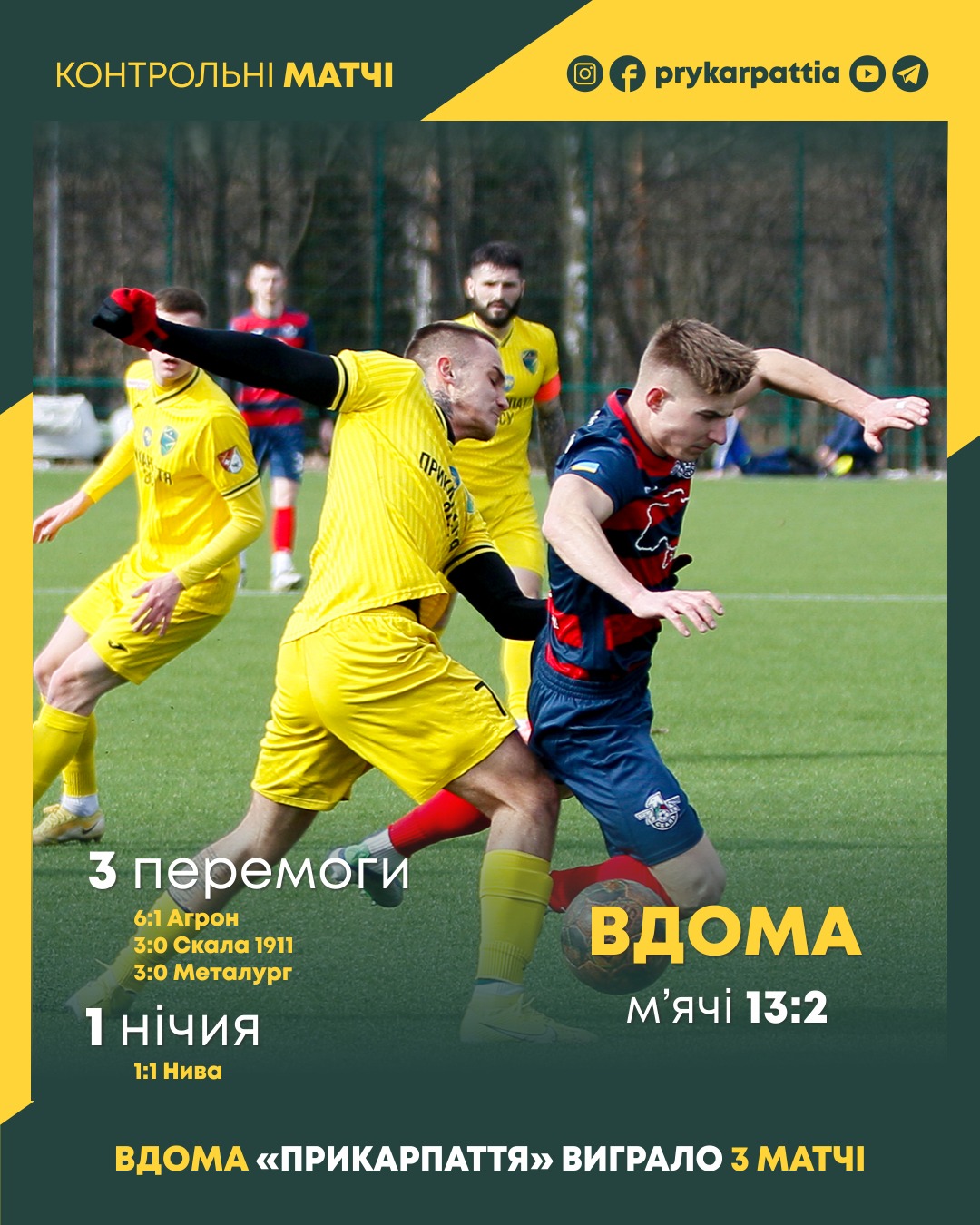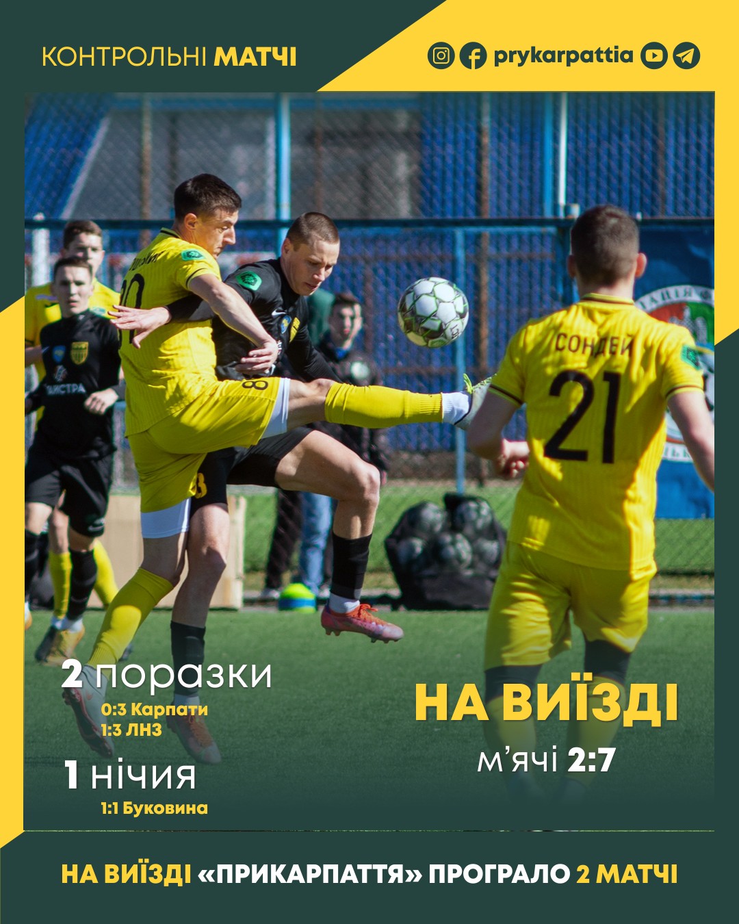 Ще з двома представниками VBET UA Першої “зелено-жовті” зіграли внічию – 1:1 у Чернівцях з “Буковиною” та в Радчі з тернопільською “Нивою” теж 1:1. Серію зимово-весняних спарингів “Прикарпаття” завершило “сухою” перемогою над запорізьким “Металургом” – 3:0.