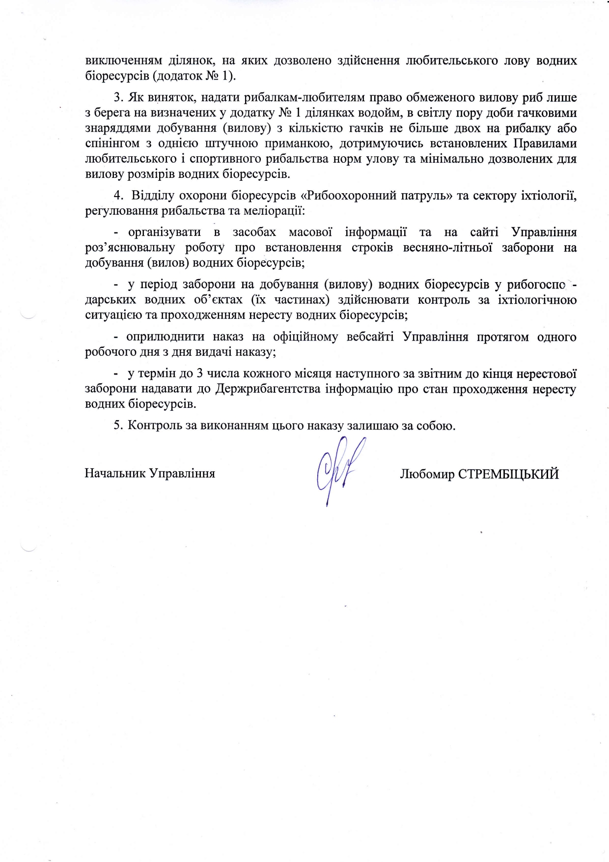 Водночас у період нересту дозволяється вилов одній особі за добу 3 кг + 1 шт. (особина будь-якої маси у мінімально дозволених для добування розмірах видів водних біоресурсів) риби гачковими знаряддями вилову з кількістю гачків не більше двох на рибалку або спінінгом з однією штучною приманкою з берега на ділянках, не заборонених для здійснення любительського рибальства на період весняно-літньої заборони.