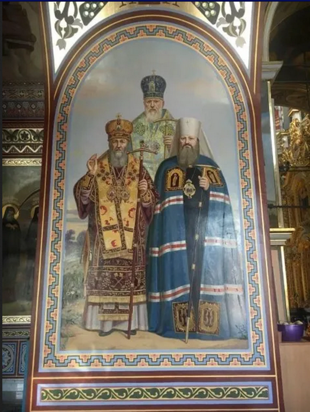 На малюнку, схожому на ікону, церковник стоїть поряд із главою Української православної церкви Московського патріархату Онуфрієм та покійним митрополитом Володимиром Сабоданом.