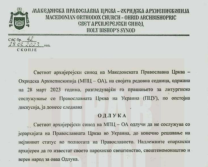 28 березня Священний синод єпископів Македонської Православної Церкви на своєму черговому засіданні розглянув питання щодо можливості літургійного співслужіння з т.зв. “Православною церквою України”.