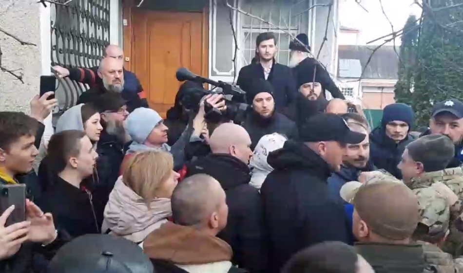 Серед присутніх десятки поліцейських, а також 20 військовослужбовців, зокрема бригади, де служив постраждалий. Відповідні кадри публікує Telegram-канал DroBro7/24. Людям вдалося проломити ворота та зайти на територію церкви. Вони тримають у руках прапори України та плакати з написом “Московський патріархат – прокляття України”. Активісти також вигукують: “Геть московського попа!”, передає DROBRO.