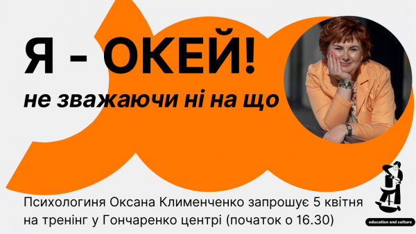 Освітньо-культурний простір "Гончаренко центр Кропивницький" запрошує бажаючих на зустріч з психологинею Оксаною Клименченко на тему "Я - окей, не зважаючи ні на що!" у середу, 5 квітня (початок о 16.30, тривалість - біля півтори години)....