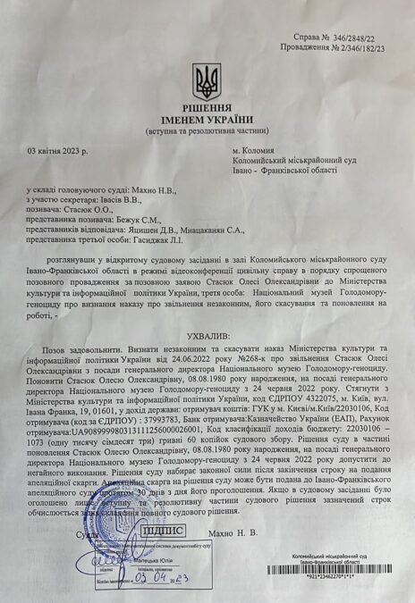 Суд задовольнив позов Стасюк і визнав незаконним наказ міністра культури та інформаційної політики про її дострокове звільнення від 24 червня 2022 року.