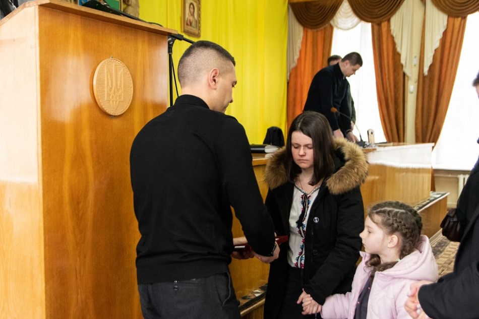 У понеділок, 3 квітня, начальник Дрогобицької районної військової адміністрації Степан Кулиняк разом з начальником Дрогобицького РТЦК та СП Миколою Лисаком у присутності командирів військових частин, голів громад, керівників правоохоронних органів та центральних територіальних органів виконавчої влади вручили державні нагороди від Президента України родичам загиблих Героїв України у повномасштабній російській війні для їхніх чоловіків, батьків, синів та дітей посмертно, передає DROBRO.
