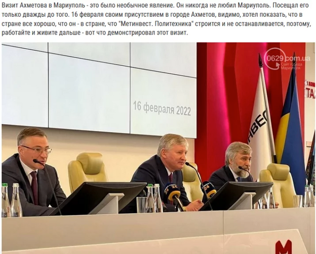 …Передчуття великої війни було. Військові казали: ми не знаємо, якою буде нова фаза війни, але вам краще виїжджати. Бо у Маріуполі небагато взагалі-то було проукраїнських ЗМІ. Можна навіть сказати, що ми були єдиною такою редакцією. І я говорила про це колегам: якщо розпочнеться повномасштабний наступ, треба виїжджати. Розмова відбулася 16 лютого. Саме тоді, коли до Маріуполя приїхали Ахметов та Президент. Хоча вони переконували своїми постатями, що навпаки: не треба їхати, все спокійно, саме тоді ми й зрозуміли: війна неминуча (див. фото сайту 0629 від 16.02.22 нижче).
