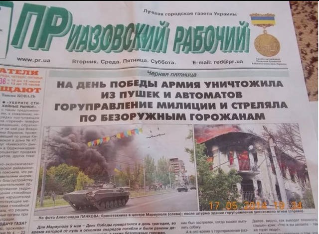 ДОВІДКА «ОРД». Поки у місті господарювала т.зв. «ДНР», «Приазовский рабочий» великим тиражем видавав проросійські спецвипуски. У річницю звільнення Маріуполя мер із ПР Ю. Хотлубей разом із НСЖУ першими нагородили Олександра Панкова та його жінку Людмилу Єрмишину, які у травні 2014 року вдвох написали статтю під назвою «На день Победы армия уничтожила из пушек и автоматов горуправление милиции и стреляла по безоружным горожанам» (Фото вище). Цей витвір газета з сайту видалила. Але доступний інший, де Панков описує штурм військової частини «днрівцями» у квітні 2014, як «проведення масового мітингу під воротами частини» та засуджує українських військових: «Жители возмущены тем, что очереди из автоматического оружия могли привести к гибели и ранениям мариупольцев. Как можно было разместить воинскую часть практически в центре города!».