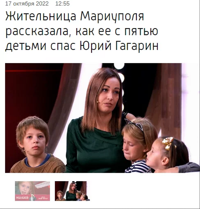 Ситник Наталії Миколаївни, 16.05.1993 р.н., яка зареєстрована за адресою: 87450, Донецька обл., Першотравневий р-н, смт Ялта, вул.Гагаріна, 15. Українська поліція скаржилася на неї до суду в 2020 та 2021 р. за: 1) Невиконання батьківських обов’язків щодо виховання дітей та антисанитарних умов; 2) Домашнє насильство, яке Ситник в стані алкогольного сп`яніння вчинила по відношенню до своєї матері. Але Ситник не була позбавлена батьківських прав та лише отримала попередження. Діти Наталії Ситник разом із матір’ю брали участь у кількох пропагандистських передачах. У Малахова Ситник розповідала про «звірства укронацистів з Азова», «бомбардування пологових будинків ЗСУ», і дякувала військовому злочинцю Юрію Гагаріну, який взяв собі прізвисько Ангел. Цей мешканець Челябінська 1970 р.н. добровольцем воює проти України у складі батальйону «Апостол» т.зв. «народної міліції Днр». Його син теж був найманцем, з пвк «Вагнер» був в Сирії, там загинув. Гагарін стверджує, що викрав та вивіз із Маріуполя 367 українських дітей. У численних інтерв’ю розповідає про «розстріли жінок та дітей українькими військовими». Глядачам Малахова Ю. Гагарін (на фото нижче) вихвалявся, як вкрадені їм «діти змінилися». Тепер вони питають в «доброго дядька»: «А чи не прийдуть знов людожери українці». Адже «рятівник» розповів дітям, що їхніми «тілами прикривалися бійці «Азову», виставляючи їх у вікна як живий щит». Крім того, як розповів викрадач, до початку «спецоперації» маріупольських школярів навчали 200 способів як не любити росіян».