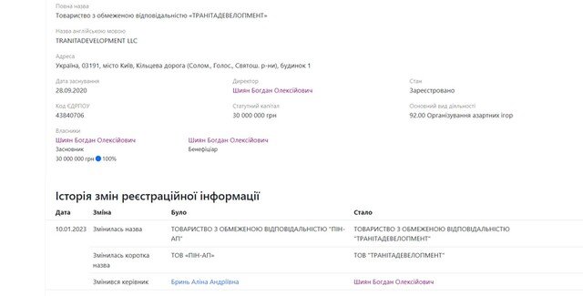 Що стосується нового «бенефіціара» ТОВ «Пін-Ап», перейменованого у ТОВ «Транітадевелопмент», то ним з 10 січня 2023 року вважається якийсь Богдан Олексійович Шиян.