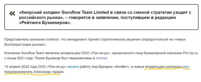 А Guruflow Team Ltd до квітня 2022 була власником російської ТОВ «Пін-ап.ру». У квітні 2022 року вийшла така заява: