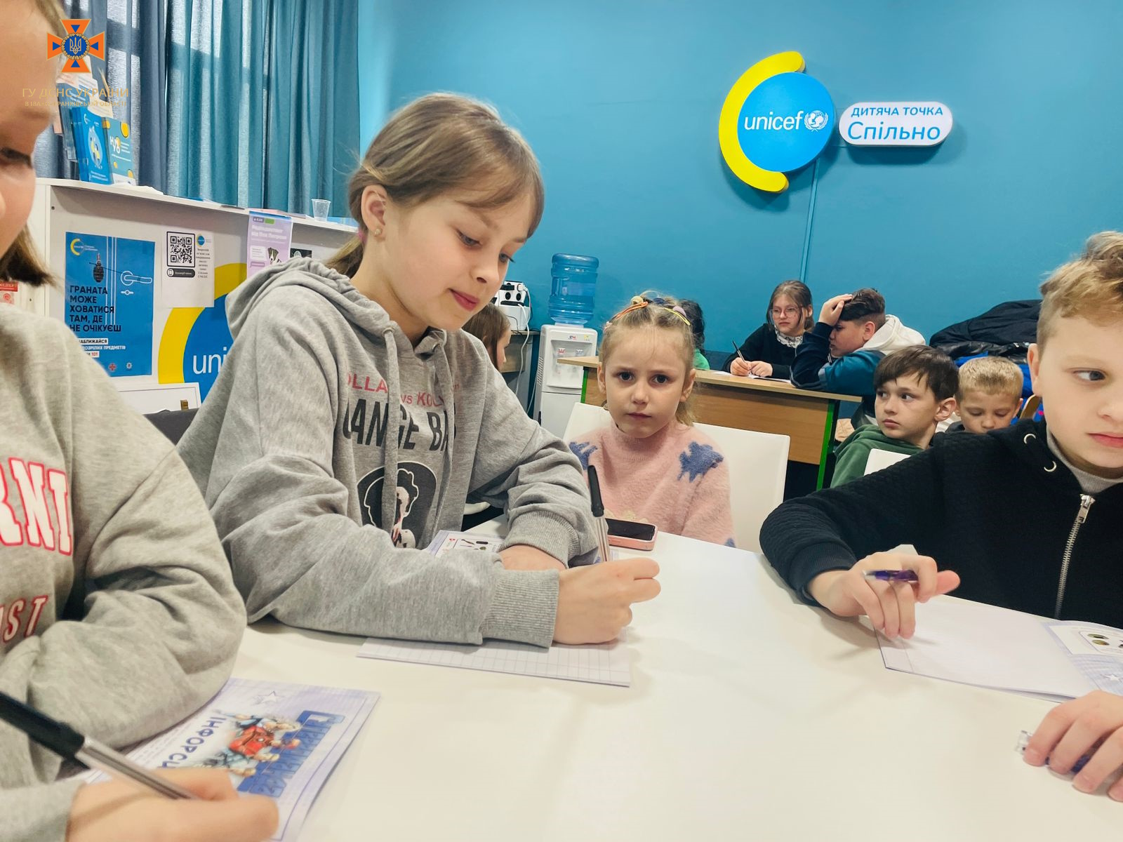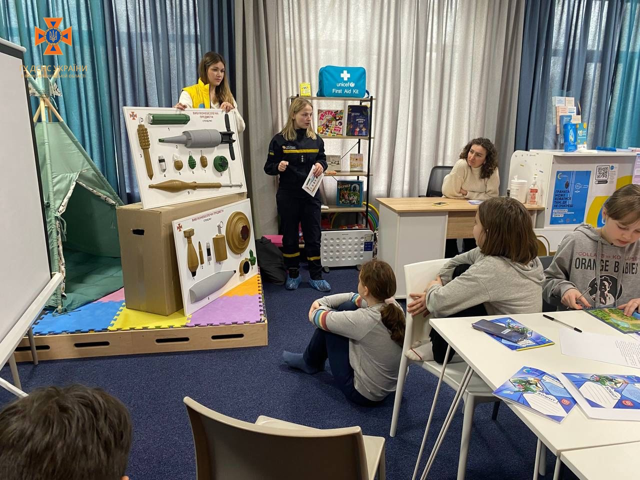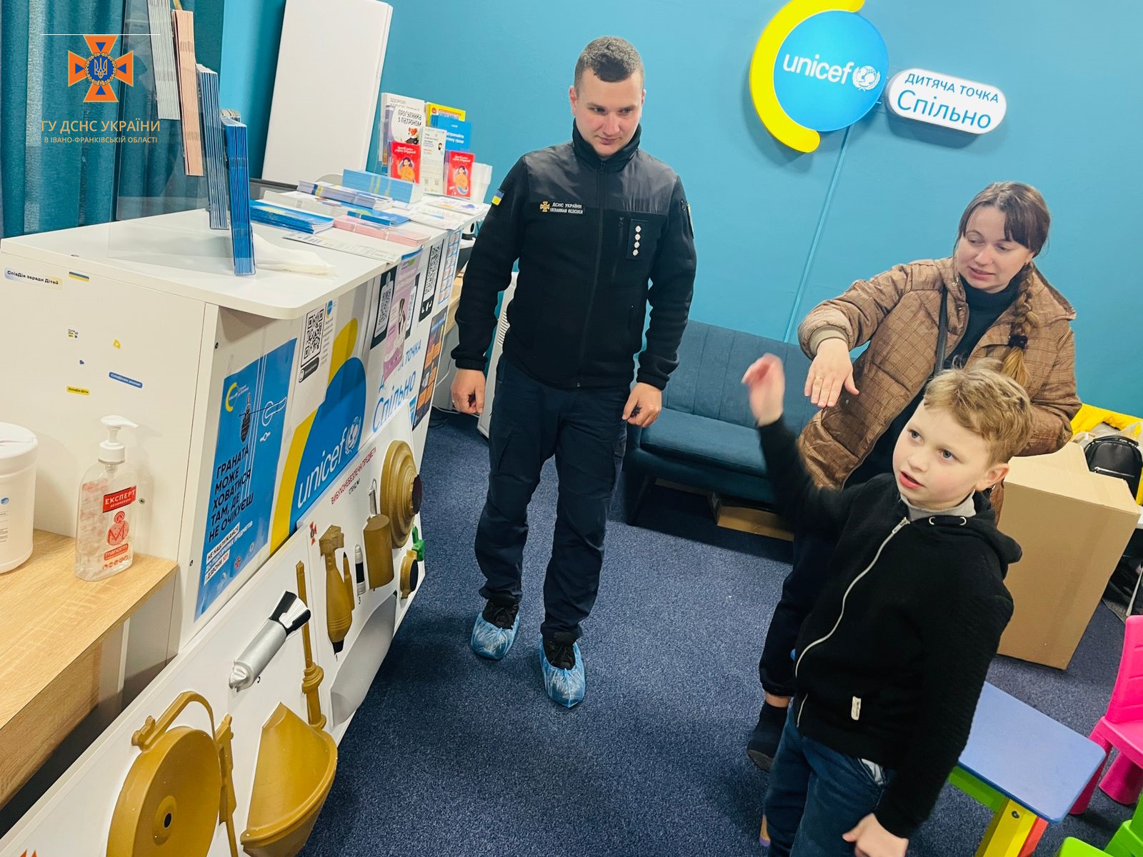 Рятувальники також завітали до маленьких відвідувачів мобільної точки ” ЮНІСЕФ Спільно” та долучились до написання радіодиктанту для дітей молодшої та середньої школи з безпечної поведінки з мінами та нерозірваними боєприпасами «Пес Патрон застерігає».