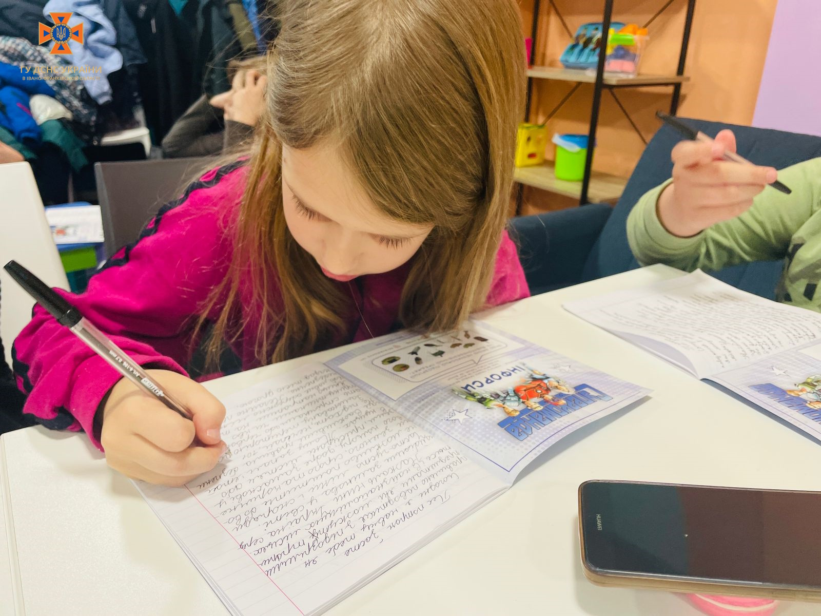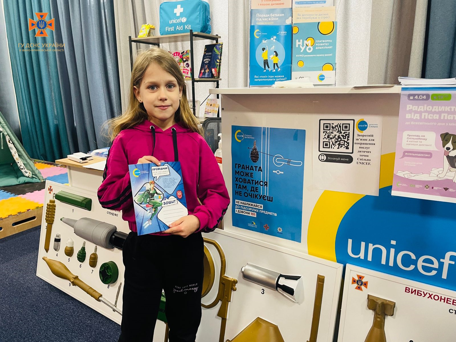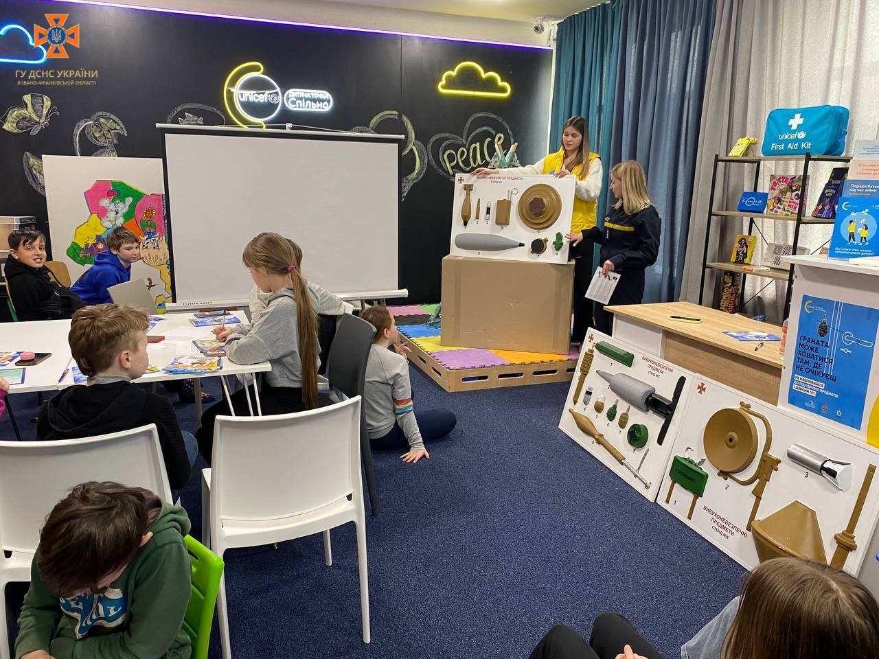 Рятувальники також завітали до маленьких відвідувачів мобільної точки ” ЮНІСЕФ Спільно” та долучились до написання радіодиктанту для дітей молодшої та середньої школи з безпечної поведінки з мінами та нерозірваними боєприпасами «Пес Патрон застерігає».