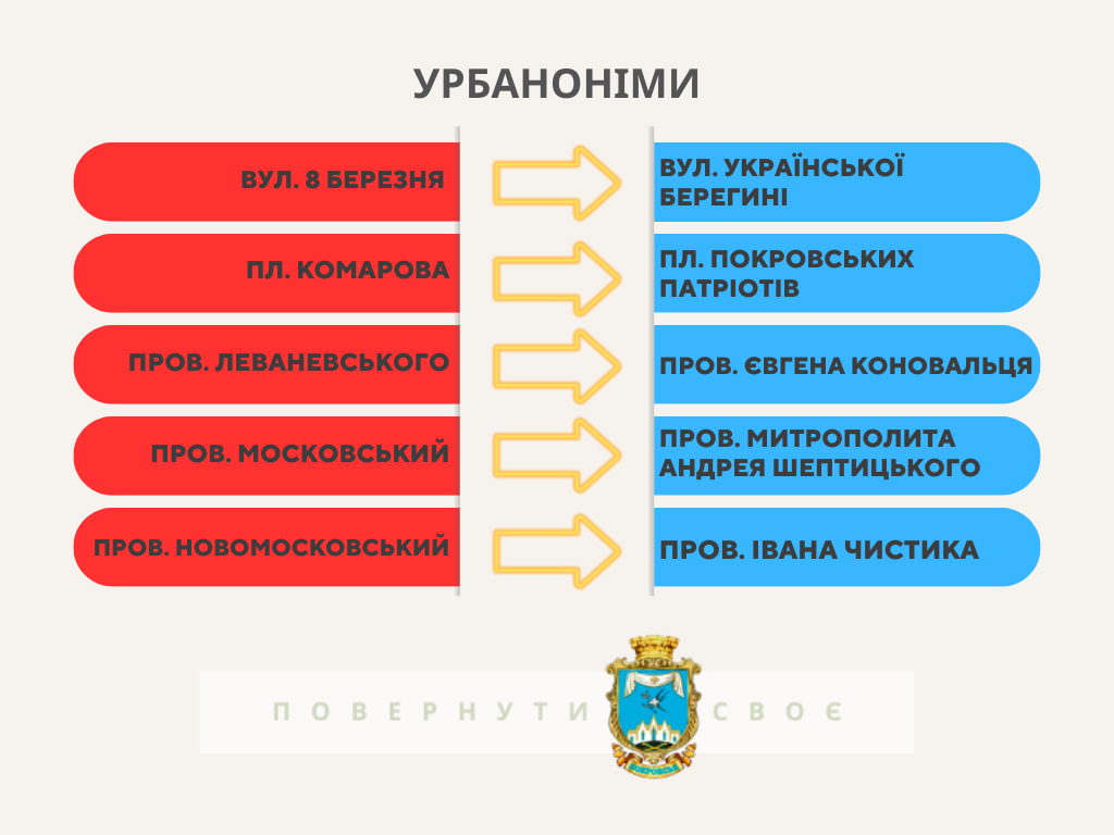 1 квітня розпочалися громадські обговорення, в яких покровчани мають визначити нові чи залишити старі урбаноніми - власні імена внутрішньоміських топографічних об'єктів. До 1 травня включно всі члени громади можуть висловити свою думку щодо перейменування. Цей процес має важливе значення. Попри те, що триває війна (а якщо розібратися, то саме тому, що триває війна) в українських містах процеси перейменування набувають важливого значення — через них відбувається впровадження політики пам’яті. Пам’ятники та назви вулиць є частиною образу міста, а його елементи впливають на нас як на індивідуальному, так і на суспільному рівні. Коли ми живемо на вулиці, що має ім'я російського ідеолога, то у свідомості нормалізуємо загарбницьку поведінку. На території України радянська влада давала назви вулицям, бібліотекам та культурним закладам не на честь української інтелігенції, а на честь росіян — навіть тих, що брали участь у репресіях проти українського народу. Впливаючи таким чином на публічний простір, російська влада намагалась знищити культурну спадщину і пам’ять українців. Покровська міська військова адміністрація закликає мешканців активно долучатися до процесу перейменування, брати участь в обговореннях та погоджуватися чи не погоджуватися із запропонованими варіантами змін. Створюйте комфортні для себе й майбутніх поколінь означники простору існування, беріть участь у написанні тексту власного міста. Перейменування назв вулиць, пов'язаних із загарбницьким режимом, – обов'язкова умова того, щоб у нашій державі відбулися позитивні суспільні перетворення. Покровська МВА пропонує вашій увазі декілька топонімів з тих, які запропоновано до зміни. вул. 8 Березня - вул. Української Берегині Підстава для перейменування: 8-е Березня – Міжнародний жіночий день. Ідея Міжнародного жіночого дня запропонована Кларою Цеткін (Соціал-демократична партія Німеччини) на великій жіночій зустрічі, організованій Соціалістичним Інтернаціоналом у Копенгагені 26 і 27 серпня 1910 року. Святкування набуло поширення в основному в СРСР та соціалістичних країнах. Підстава для нової назви: з метою зазначення історично шанобливого відношення до української жінки. Берегинею (Оберегою) в часи Козаччини позначали Жінку і Дружину, підкреслюючи її високу соціальну роль. Протягом багатьох століть українки не тільки не поступалися чоловікам у культурній, політичній, освітній і навіть військовій діяльності, але й подекуди перевершували їх. Крім того, українські жінки завжди були берегинями родини. пл. Комарова - пл. Покровських Патріотів Підстава для перейменування: Володимир Комаров (1927, Москва — 19671967) – льотчик-космонавт СРСР, двічі Герой Радянського Союзу (1964, 1967). Загинув під час посадки космічного корабля "Союз-1". До міста стосунку не має. Підстава для нової назви: з метою вшанування мешканців Покровської громади, які героїчно стали на захист територіальної цілісності батьківщини як під час гібридної війни у 2014 році, так і з перших днів повномасштабного вторгнення окупаційної армії рф на територію України. пров. Леваневського - пров. Євгена Коновальця Підстава для перейменування: Сигізмунд Леванєвський (1902 –1937) – льотчик, Герой Радянського Союзу. Народився в Санкт-Петербурзі. Загинув під час перельоту Москва – Архангельськ – острів Рудольфа – Пі