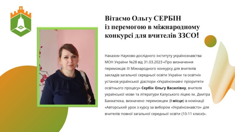 Вчителька української мови та літератури калуського ліцею ім. Бахматюка Ольга Сербін – серед переможців III міжнародного конкурсу для вчителів закладів загальної середньої освіти.