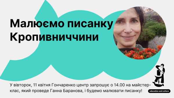 Освітньо-культурний простір "Гончаренко центр Кропивницький" запрошує бажаючих на майстер-клас з писанкарства, який проведе Ганна Баранова у вівторок, 11 квітня (початок о 14.00, тривалість - біля години). Малювати будемо саме писанку, візерунок якої характерний для Кропивниччини....
