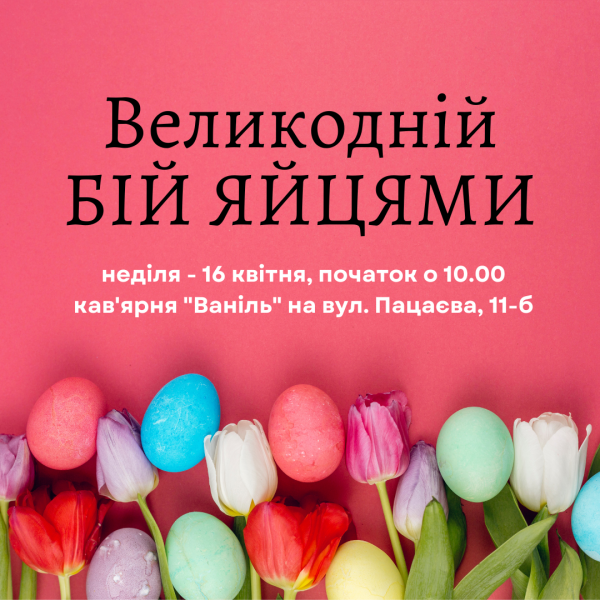 У неділю, 16 квітня, о 10.00 кав'ярня «Ваніль» (вул. Пацаєва, 11-б) у Кропивницькому запрошує на Великодній бій яйцями. Для участі необхідно заповнити онлайн форму за посиланням - https://7xro.short.gy/RawhZ5 - і прийти вчасно та принести з собою три варені в круту яйця. Крашанки можуть бути або пофарбовані, або з малюнком чи наліпкою, або й без нічого, головне - щоб ви вірили в їх незламність!...