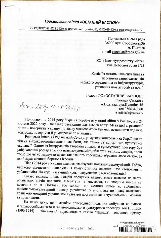 Звернення було направлено ГС "Останній Бастіон" 16.08.2022 року за вих. № 22.
