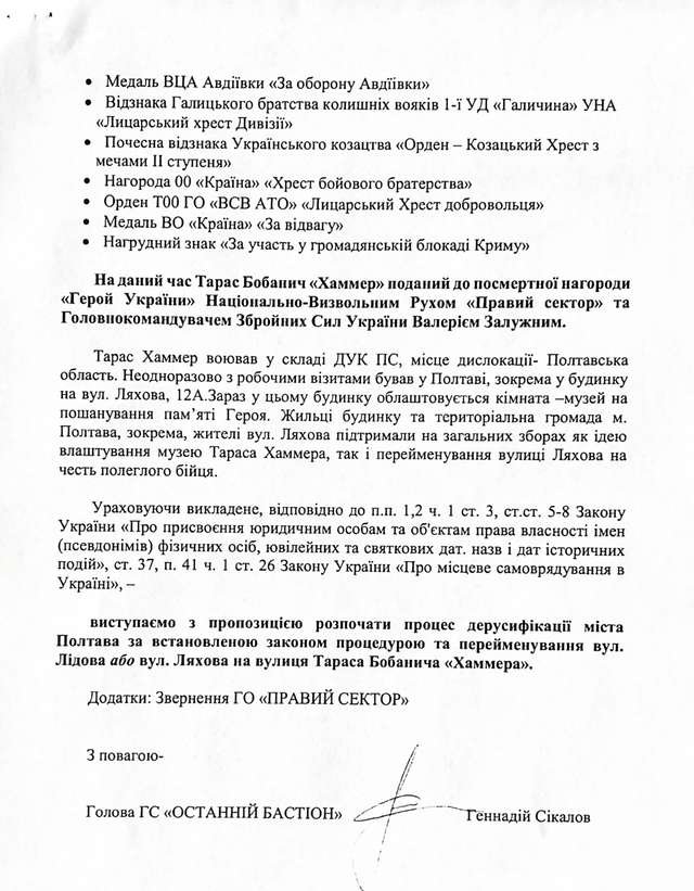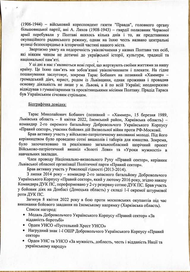 Серед варіантів нових назв вулиць Лідова та Ляхова у місті Полтаві відсутній варіант з пропозицією перейменування вул. Лідова чи вул. Ляхова на честь Героя України Тараса Бобанича “Хаммера”.