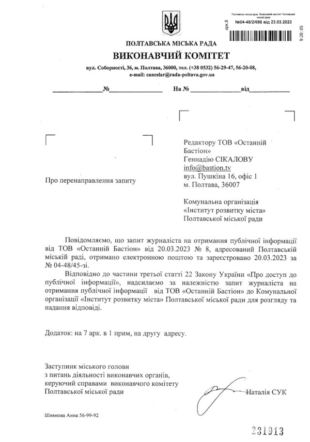 20 березня "Останній Бастіон" направив до Полтавської місткої ради та "Інституту розвитку міста" запит журналіста, в якому просив: