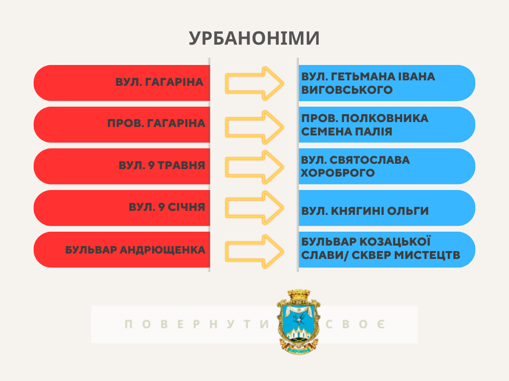 Нагадуємо, що тривають громадські обговорення, в яких містяни мають визначити нові чи залишити старі урбаноніми - власні імена внутрішньоміських топографічних об'єктів. Всі члени громади можуть висловити свою думку щодо перейменування.Надати пропозиції можна до 01 травня 2023 року (включно): на електронну пошту [email protected]з приміткою «перейменування об’єктів топоніміки»; у письмовій формі на адресу: м. Покровськ, пл. Шибанкова, 11 будівля міської ради, відповідальна особа Птушко Олена Іллівна (тел. 380978791633). Пропонуємо вашій увазі наступний перелік топонімів з тих, які запропоновано до зміни: вул. Гагаріна – вул. Гетьмана Івана Виговського Підстава для перейменування: Юрій Олексійович Гагарін - перша людина у космосі (до цього - льотчик-винищувач). Символ радянської космонавтики, яка розвивалася на тлі космічних перегонів між США та СРСР як одного з проявів Холодної війни. Підстава для нової назви: був правою рукою Богдана Хмельницького, керівником Генеральної канцелярії, відповідав за дипломатичні відносини. Був ініціатором розриву угоди з Московським царством. пров. Гагаріна – пров. Полковника Семена Палія Підстава для перейменування: Юрій Олексійович Гагарін - перша людина у космосі (до цього - льотчик-винищувач). Символ радянської космонавтики, яка розвивалася на тлі космічних перегонів між США та СРСР як одного з проявів Холодної війни. Підстава для нової назви: Державний і військовий діяч Семен Пилипович Палій. Козак – характерник, фастівський полковник, “віденський богатир”, стражник поліський, народний Гетьман, будівничий Паліївщини, керівник національного селянсько-козацького повстання 1702-1704 років проти панування і свавілля польської шляхти та її гніту. Виступав за об’єднання Правобережної і Лівобережної України. Очоливши це повстання, полковник Семен Палій постав народним героєм як серед його сучасників, так і наступних поколінь. вул. 9 травня - вул. Святослава Хороброго Підстава для перейменування: 9 травня День Перемо?ги — державне свято СРСР, а пізніше деяких країн, що були окуповані колишнім СРСР. У СРСР святкувалося щорічно 9 травня з формулюванням: на згадку про переможне завершення «Великої вітчизняної війни радянського народу проти німецько-фашистських загарбників». Підстава для нової назви: на честь Великого князя Київської Русі, відважного полководця, сина князя Ігоря і княгині Ольги, батька київського князя Володимира Великого, який воював із Хазарським каганатом, Візантійською імперією (ІХ ст.). Коли войовничий князь Святослав Хоробрий йшов на ворога, він ніколи не нападав на нього зненацька. Перед боєм завжди заздалегідь попереджав своєю знаменитою фразою: «Іду на Ви!» вул. 9 січня - вул. Княгині Ольги Підстава для перейменування: 9 січня за старим стилем у Санкт-Петербурзі влада жорстоко розігнала мирну демонстрацію, учасники якої мали на меті вручити цареві «Петицію робітників і жителів Петербурга для подання Миколі II». Розстріл велелюдного мітингу, який отримав назву «кривава неділя», став одним із поштовхів до революції 1905 року. Підстава для нової назви: Давньоруська (давньоукраїнська) княгиня, дружина князя Ігоря, мати князя Святослава, впроваджувала християнство на Русі (ІХ ст.). Правління княгині було вирішальним поворотом в історії Київської Русі. Країна здобула впорядковану владу й почала і