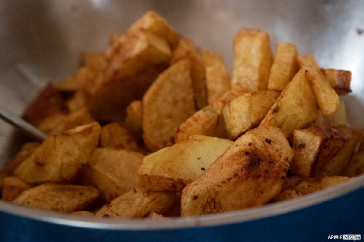 “Із перших страв у нас борщ, капусняк, бульйони курячі та грибні, суп гороховий. Смажимо котлети, відбивні, рибу. Щоразу намагаємось робити різні салати: і олів’є, і дністер тощо. У неділю традиційно готуємо чанахи по-гуцульськи зі свинячими реберцями, квасолею, картоплею та морквою. Скажу чесно, ще жодна людина від нас не вийшла незадоволеною чи голодною”.