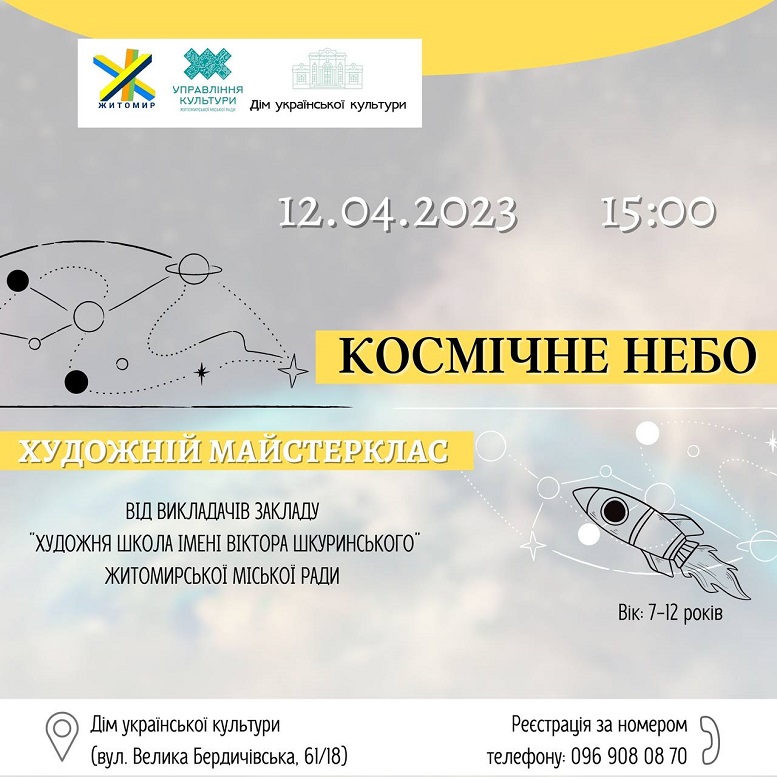 Художній майстерклас «Космічне небо» для дітлахів 7-12 років у приміщенні Дому української культури проведуть викладачі закладу «Художня школа імені Віктора Шкуринського». Початок заходу о 15.00.